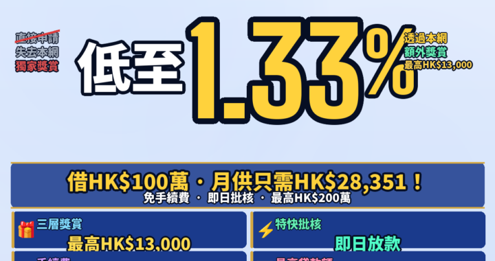 東亞銀行BEA「勁快」分期貸款2026:APR低至1.33%、手續費全免0%、最高月薪16倍借至HK$200萬,即日批核即日放款—透過本網申請可疊加三層獎賞:本網獨家HK$1,000 + 銀行迎新最高HK$7,000 + 全新客戶加碼HK$1,800,總值最高達HK$13,000 !