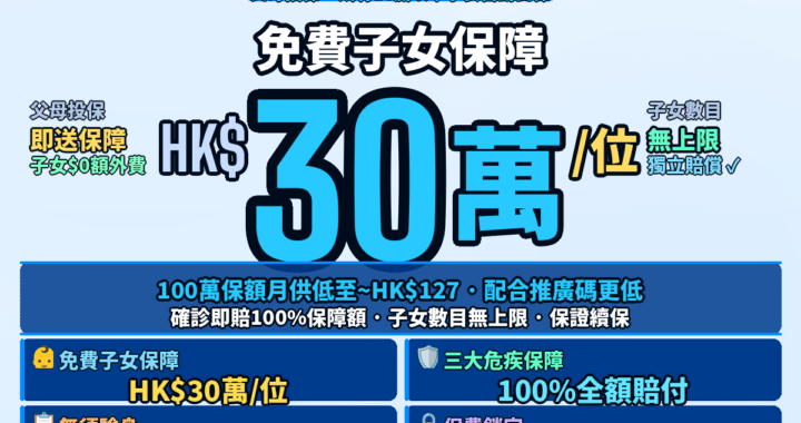 Blue WeCare危疾保障計劃1保費及保障:100萬保額月供$128起,癌症+心臟病+中風100%賠付,免費附送每位子女高達$30萬保障,10年保費鎖定不變