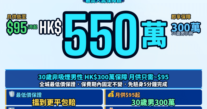 Blue定期人壽 WeCare TL3 保障計劃:零儲蓄$550萬保障月供$95起,最低價保證期內保費固定不變,高血壓免驗身可投保,10Life 9.8分保證續保至100歲