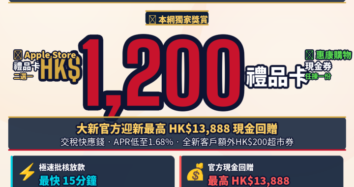 大新「快應錢」私人貸款2026:本網獨家送 HK$1,200 Apple Store 禮品卡或惠康現金券+大新官方迎新最高 HK$13,888 現金回贈+全新客戶額外 HK$200 超市券;APR 低至 1.68%,最高借 HK$200 萬,15 分鐘極速批核放款,還款期最長 60 個月,申請零手續費 !