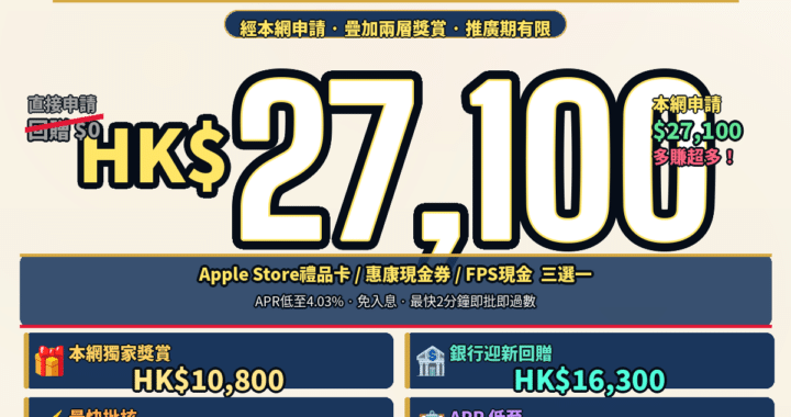渣打私人貸款2026年4月全攻略:APR低至1.85%、0%手續費!經本網獨家送iPhone 17(價值HK$8,599)或高達HK$8,000 禮品卡,疊加渣打銀行迎新最高HK$8,000現金回贈(還款期36–60個月、貸款額HK$150萬以上),最高借月薪18倍或HK$400萬、7天冷靜期