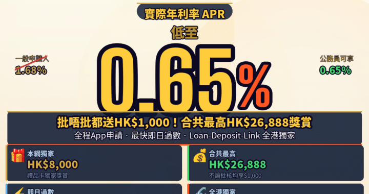 WeLab Bank私人貸款(匯立銀行):本網獨家合共最高HK$26,888獎賞(批唔批都送HK$1,000現金券),APR實際年利率低至0.65%(公務員,指定條件)、Loan-Deposit-Link存款掛鈎慳息、免文件至HK$30萬、最快即日到賬、全程App網上申請