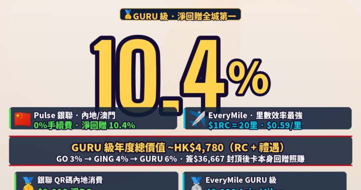 HSBC Travel Guru 會員計劃回贈攻略:銀聯內地淨回贈10.4%(0%手續費)、EveryMile低至$0.59/里,GURU級簽$36,667可賺$3,813 !