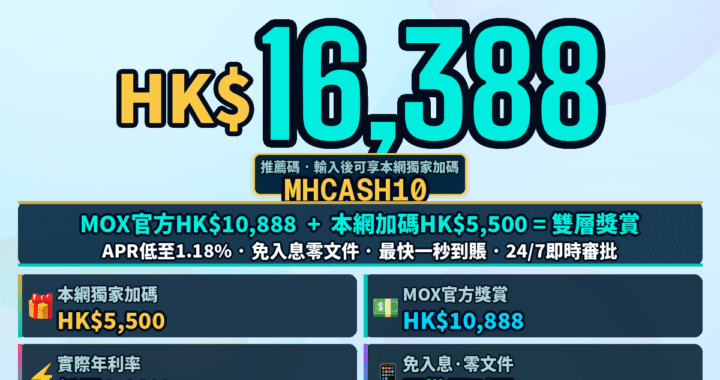 MOX「即時借」私人貸款2026稅季攻略:APR低至1.18%、免入息零文件即批、最快一秒到賬,新客 MHCASH10 雙層獎賞總值 HK$16,388