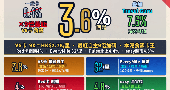 滙豐獎賞錢(RC)2026:基本0.4%升至VS卡3.6%,最紅自主獎賞、Travel Guru疊加海外達7.6%,六張卡回贈完整排名