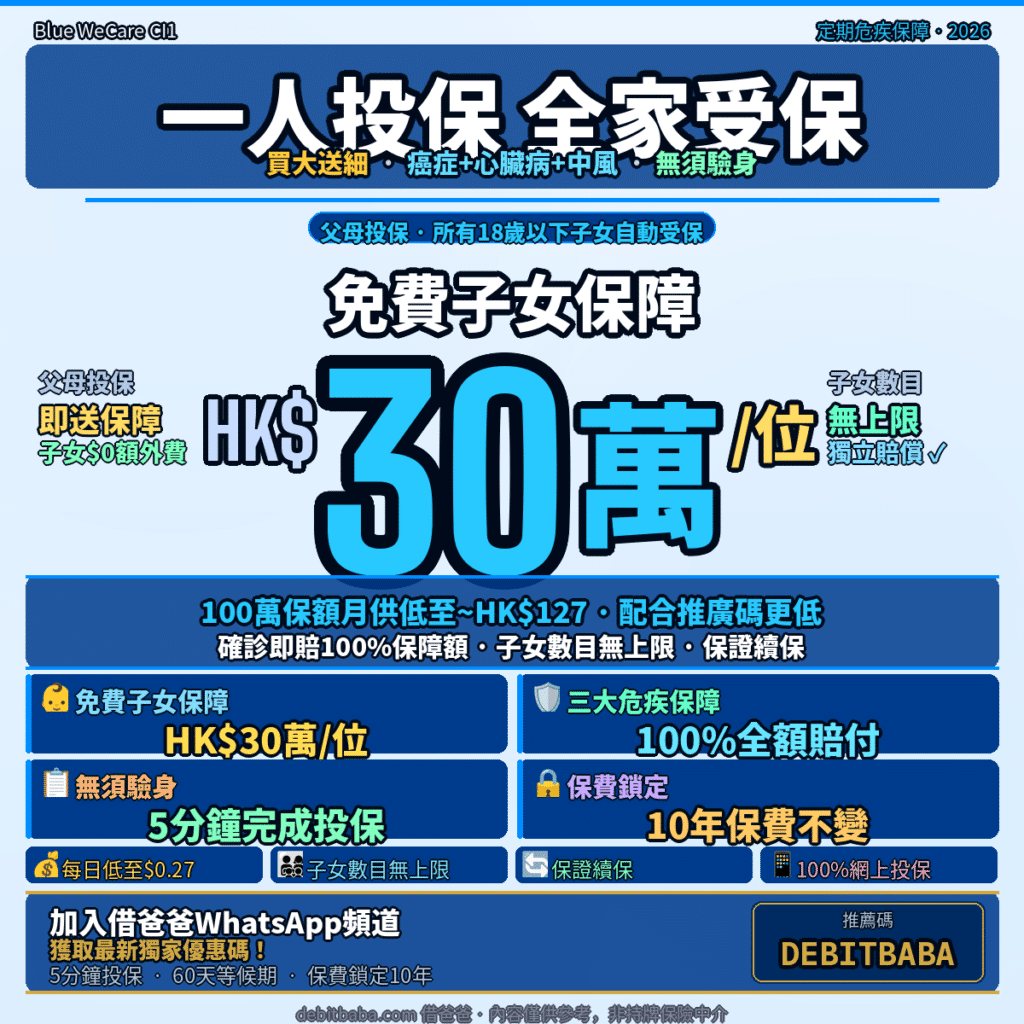 | 免費子女保障 | ✅ 有,每位最高HK$30萬 | ❌ 無 | 部分有(需額外付費) |