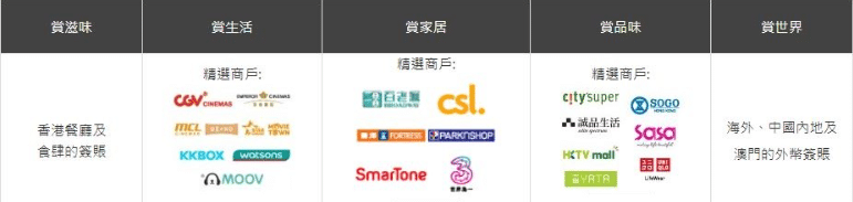 - 高回贈:自選類別簽帳享高達 3.6% 回贈(首 HK$100,000 合資格簽帳上限,與實體零售簽帳共享)。