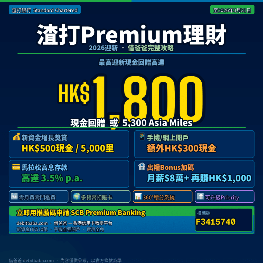 渣打Premium理財的迎新優惠每季更新,現時推廣期為即日起至2026年3月31日。借爸爸幫大家逐一拆解每個獎賞的「觸發條件」和「實際回報率」。