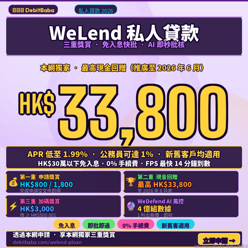 免責聲明:本文內容僅供教育及參考用途,不構成財務建議。借爸爸(DebitBaba)為內容教育平台。讀者在作出任何財務決定前,應自行向持牌專業人士查詢。所有利率、金額及推廣資料以 WeLend 及 MoneyHero 官方網站及 T&C 為準。
